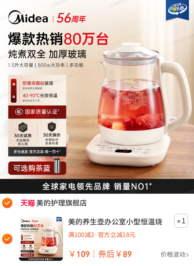 【下单链接】88¥ MF278 4KdhfW6broD¥ https://m.tb.cn/h.SkLVKqC 美的养生壶办公室小型恒温烧水炖煮一体多功能玻璃煮茶器2025新款