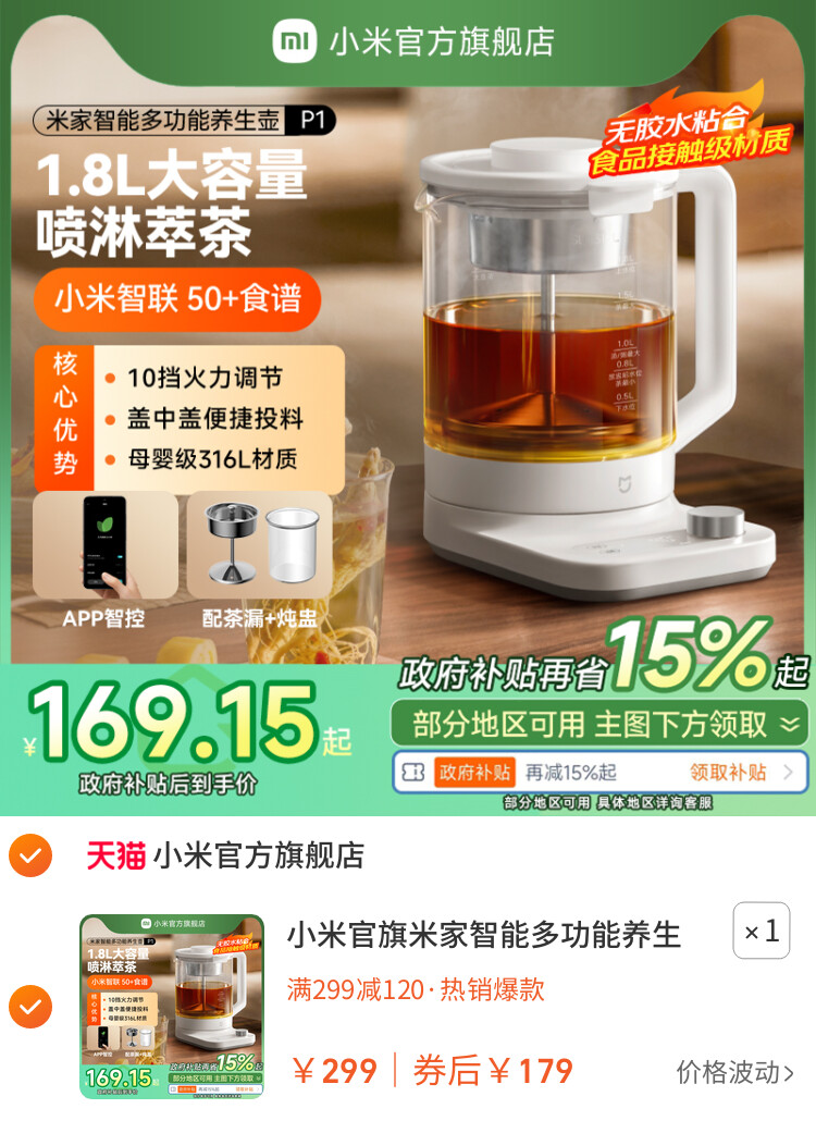 【下单链接】88¥ CZ356 3UYzfWTzWph¥ https://m.tb.cn/h.SkLXOJC 小米官旗米家智能多功能养生壶P1 炖煮烧水壶电热水壶 泡茶煮茶器